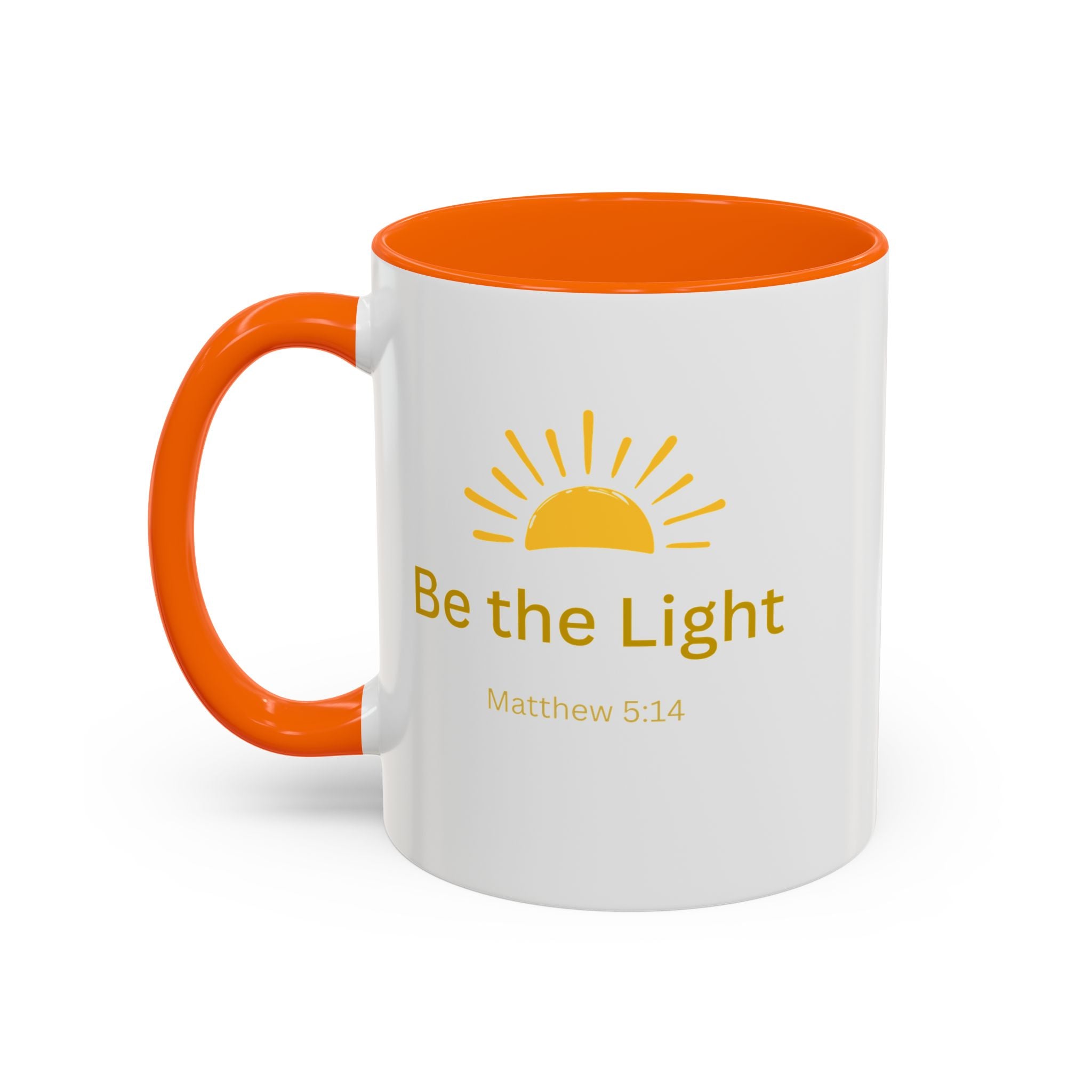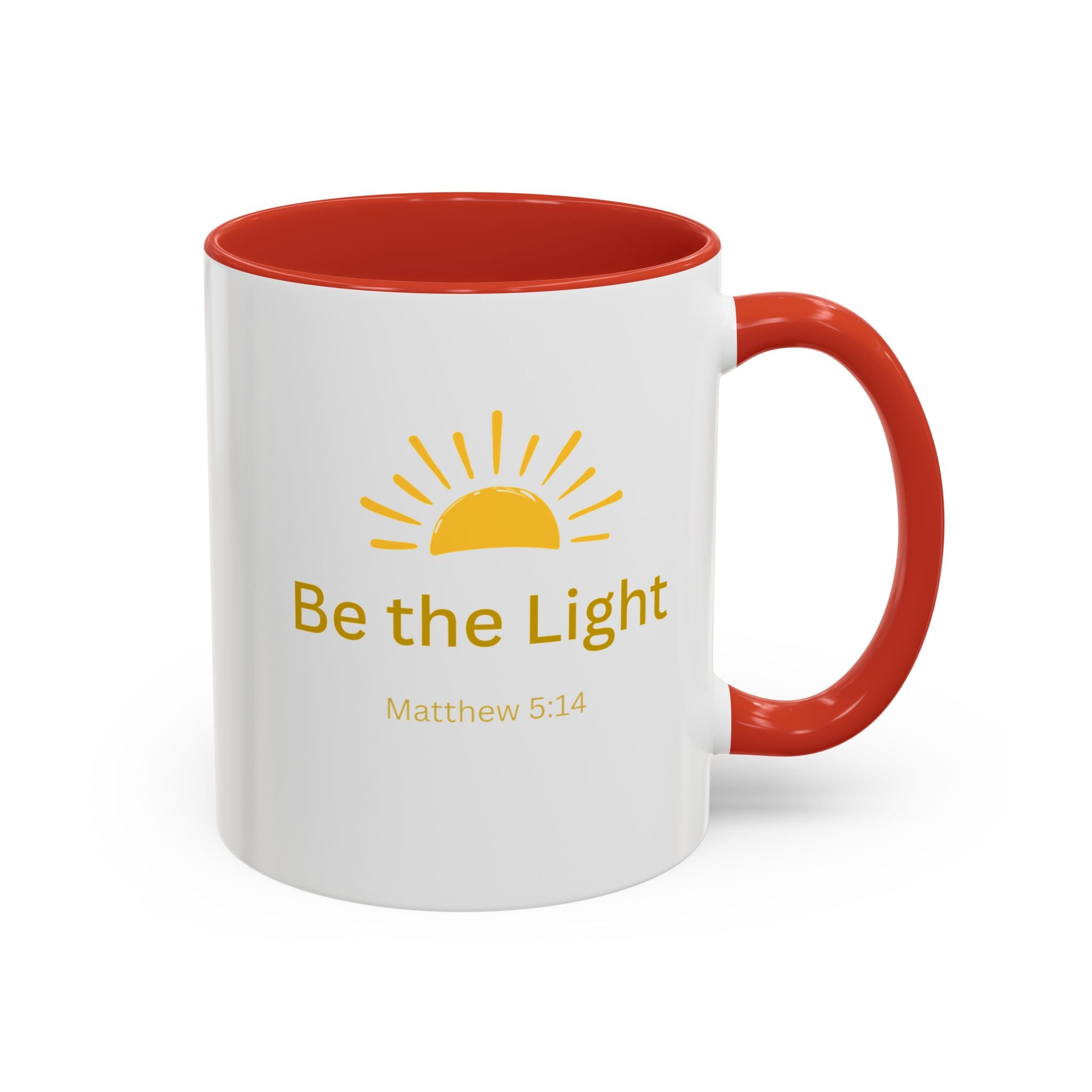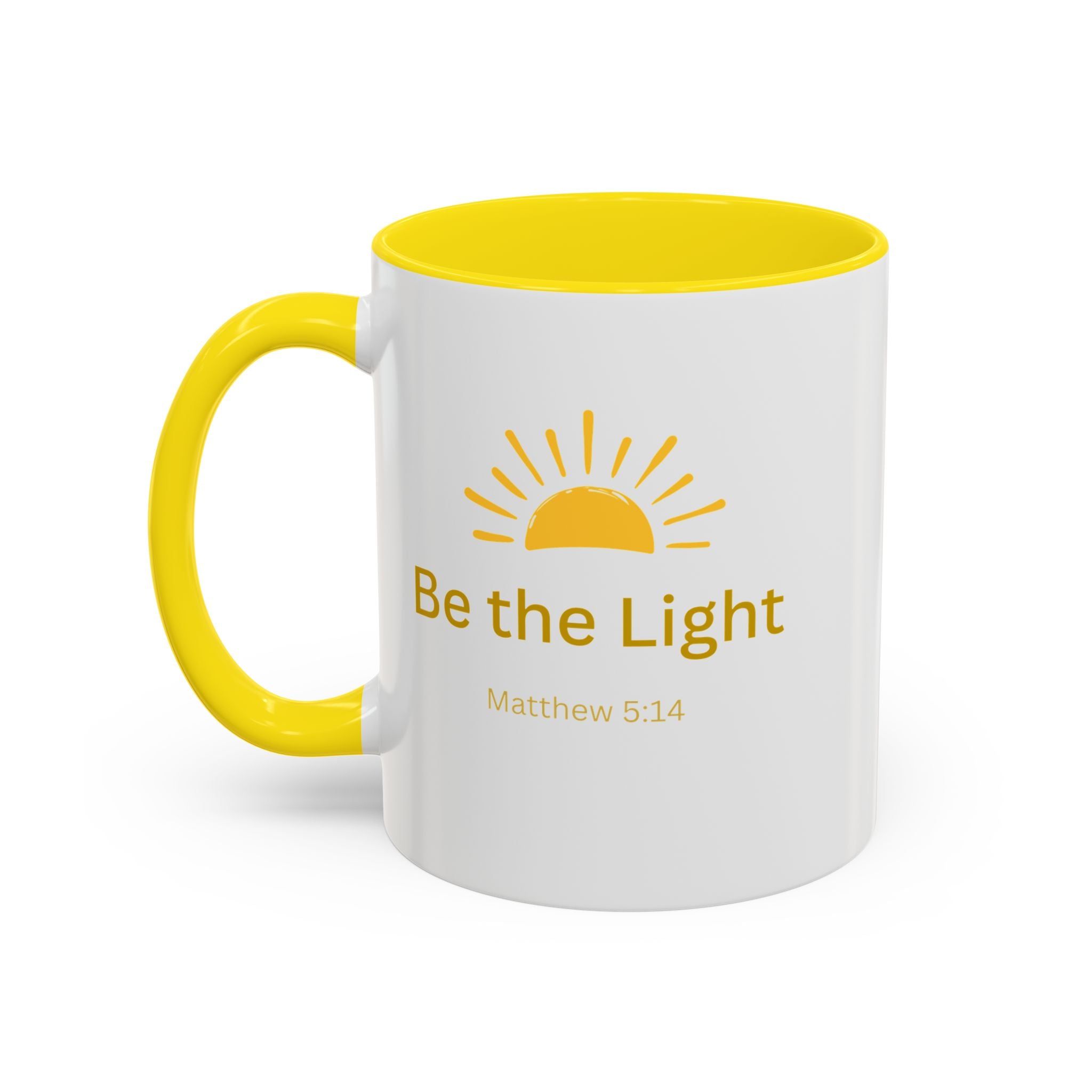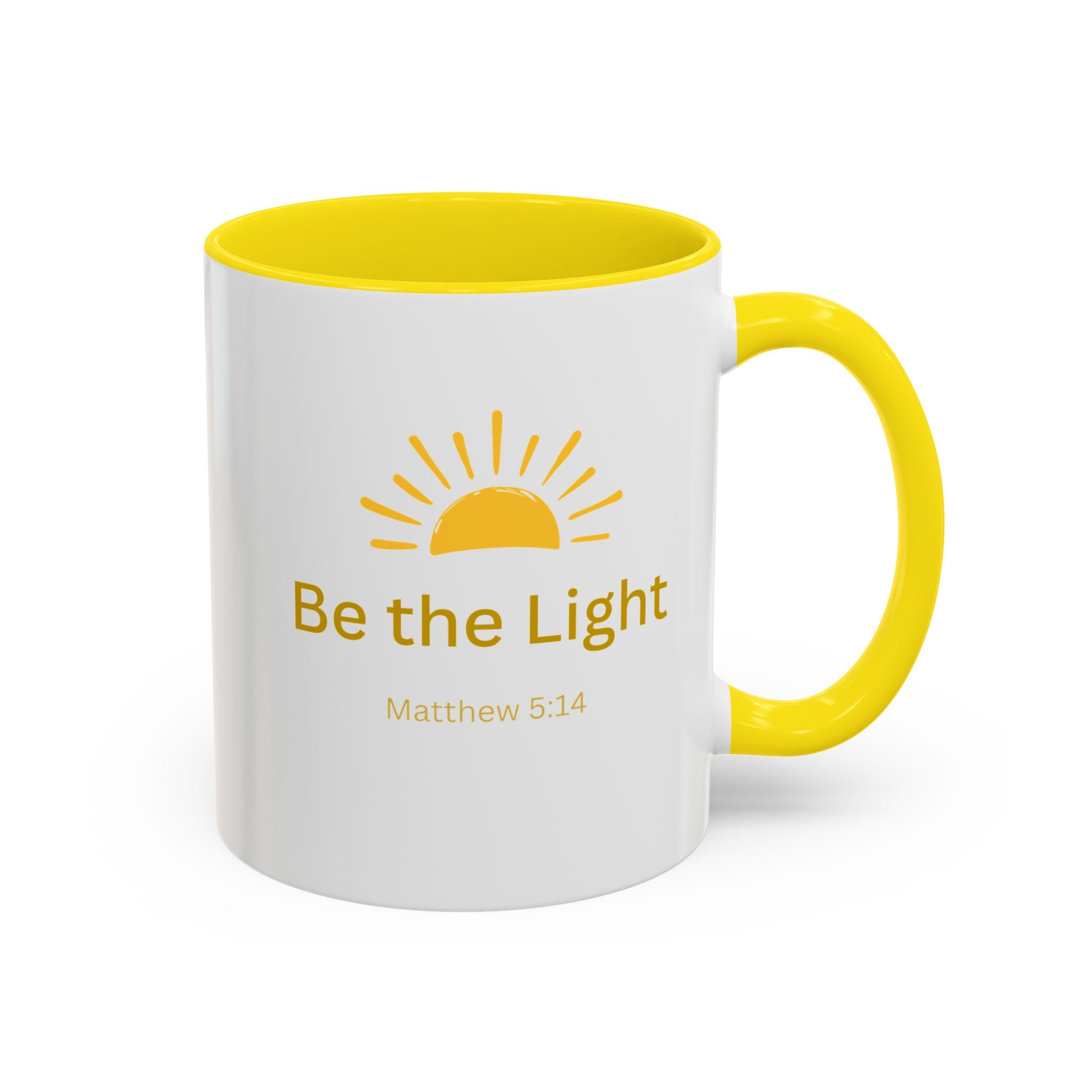 This ceramic coffee mug carries a gentle, uplifting message ’Be the Light’ beneath a warm, rising sun, bringing quiet encouragement to your morning routine. The white exterior contrasts with a colored interior and handle for a cheerful pop, while the glossy finish keeps the sun graphic bright and crisp. It’s a simple, faithful reminder to start the day with kindness, perfect for moments of reflection, study, or casual conversation over coffee or tea.