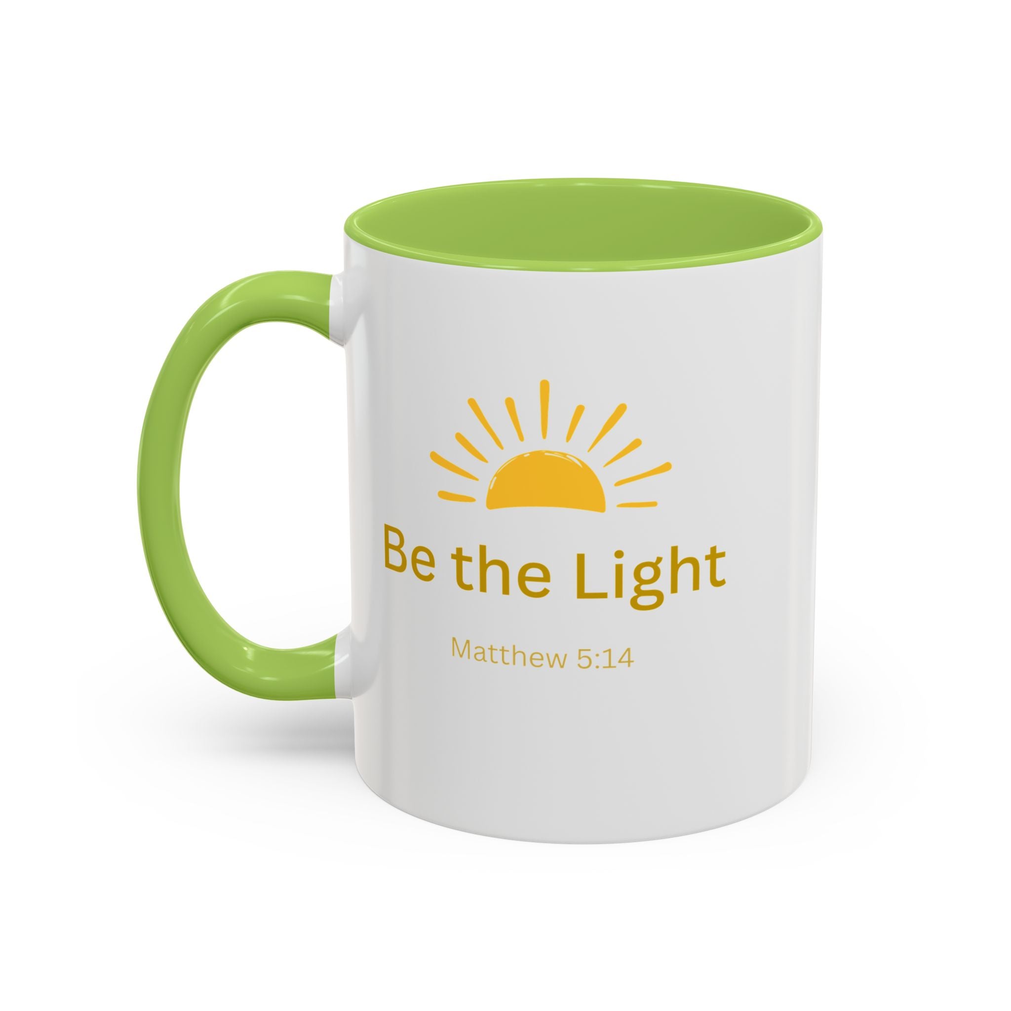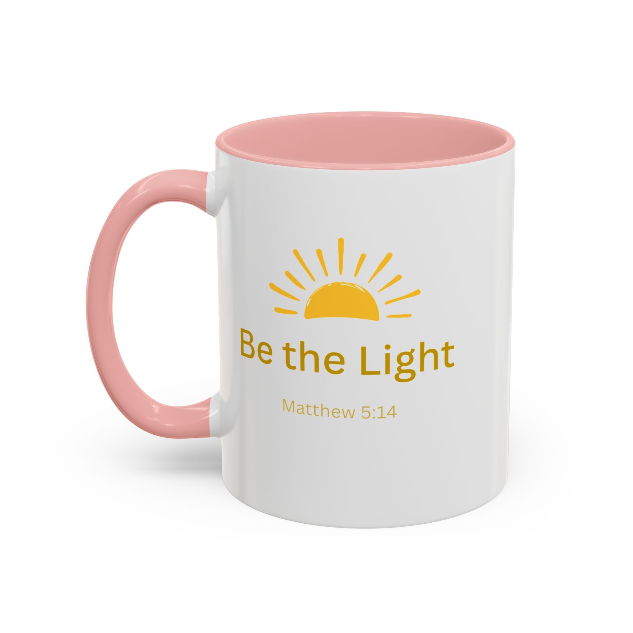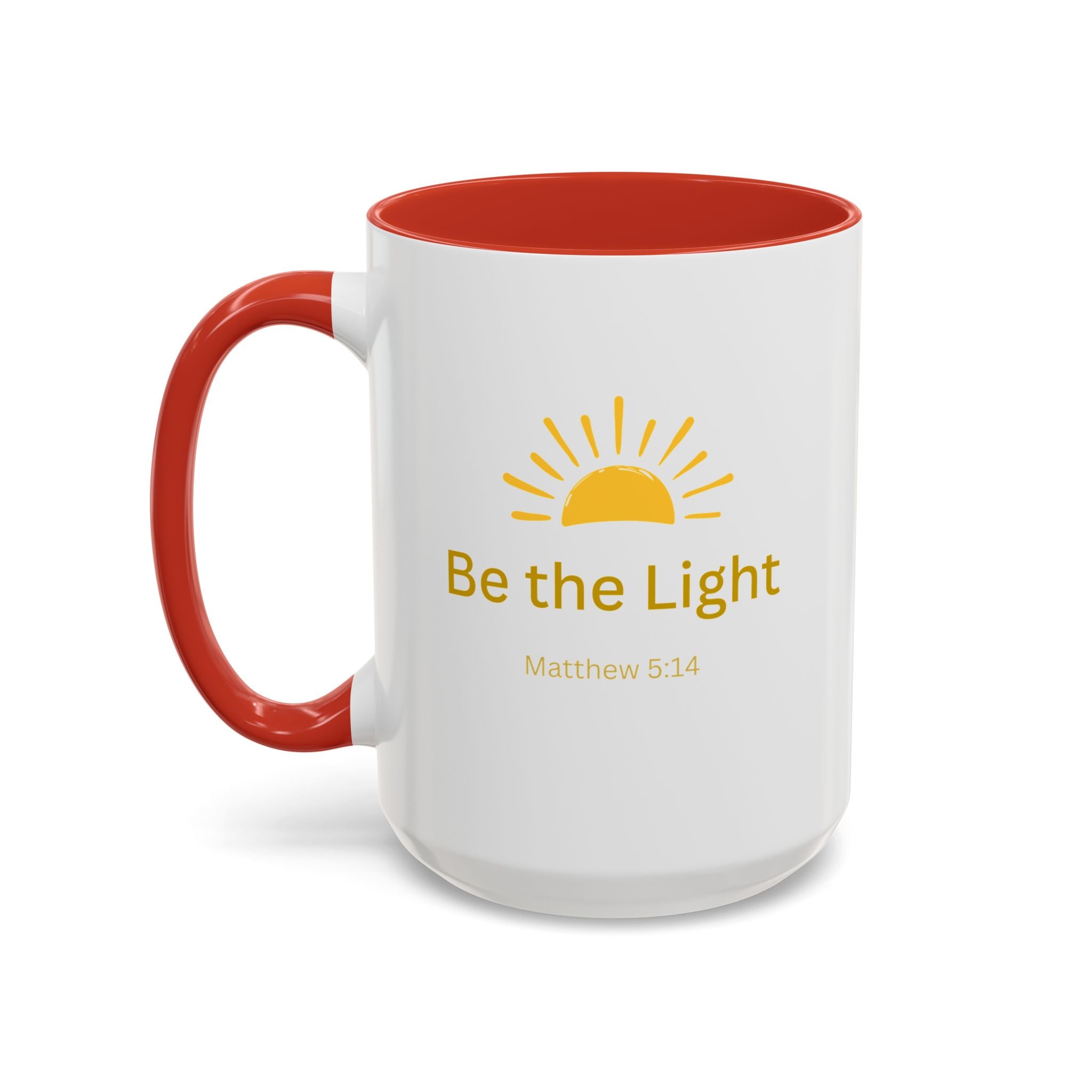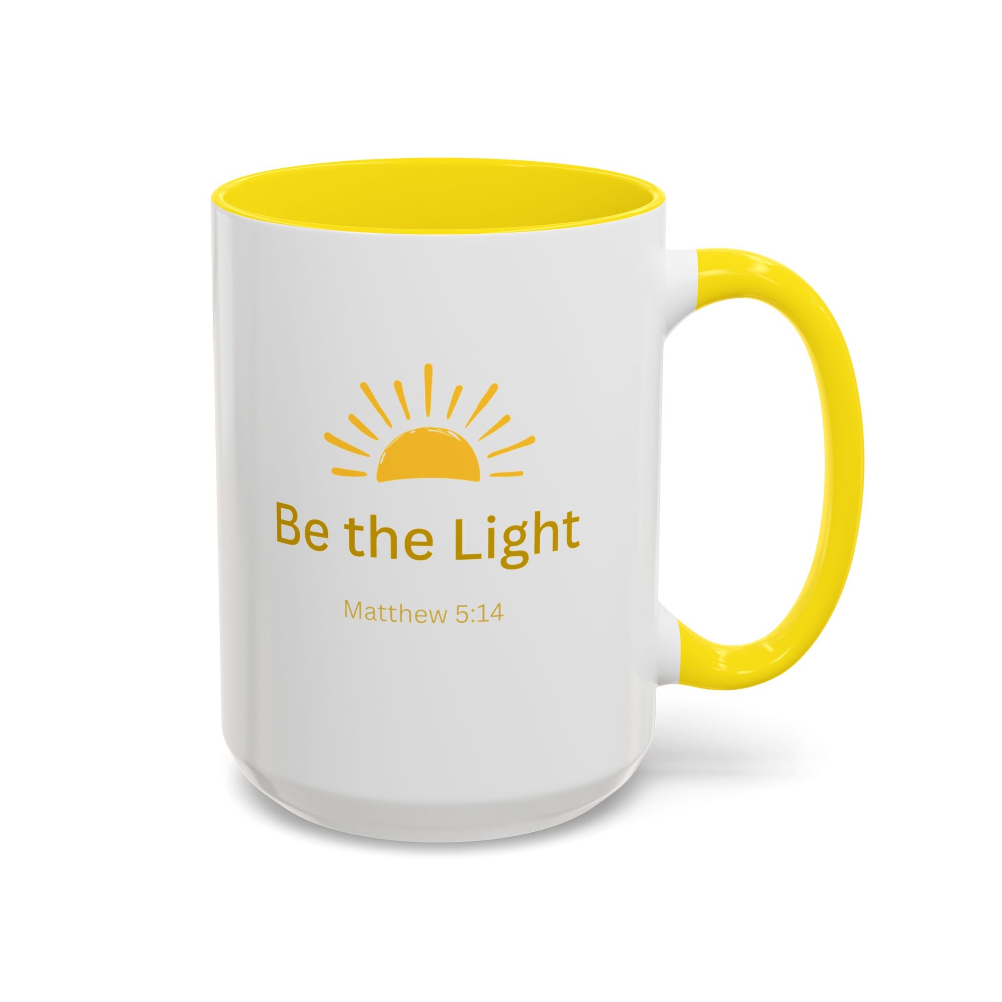 This ceramic coffee mug carries a gentle, uplifting message ’Be the Light’ beneath a warm, rising sun, bringing quiet encouragement to your morning routine. The white exterior contrasts with a colored interior and handle for a cheerful pop, while the glossy finish keeps the sun graphic bright and crisp. It’s a simple, faithful reminder to start the day with kindness, perfect for moments of reflection, study, or casual conversation over coffee or tea.