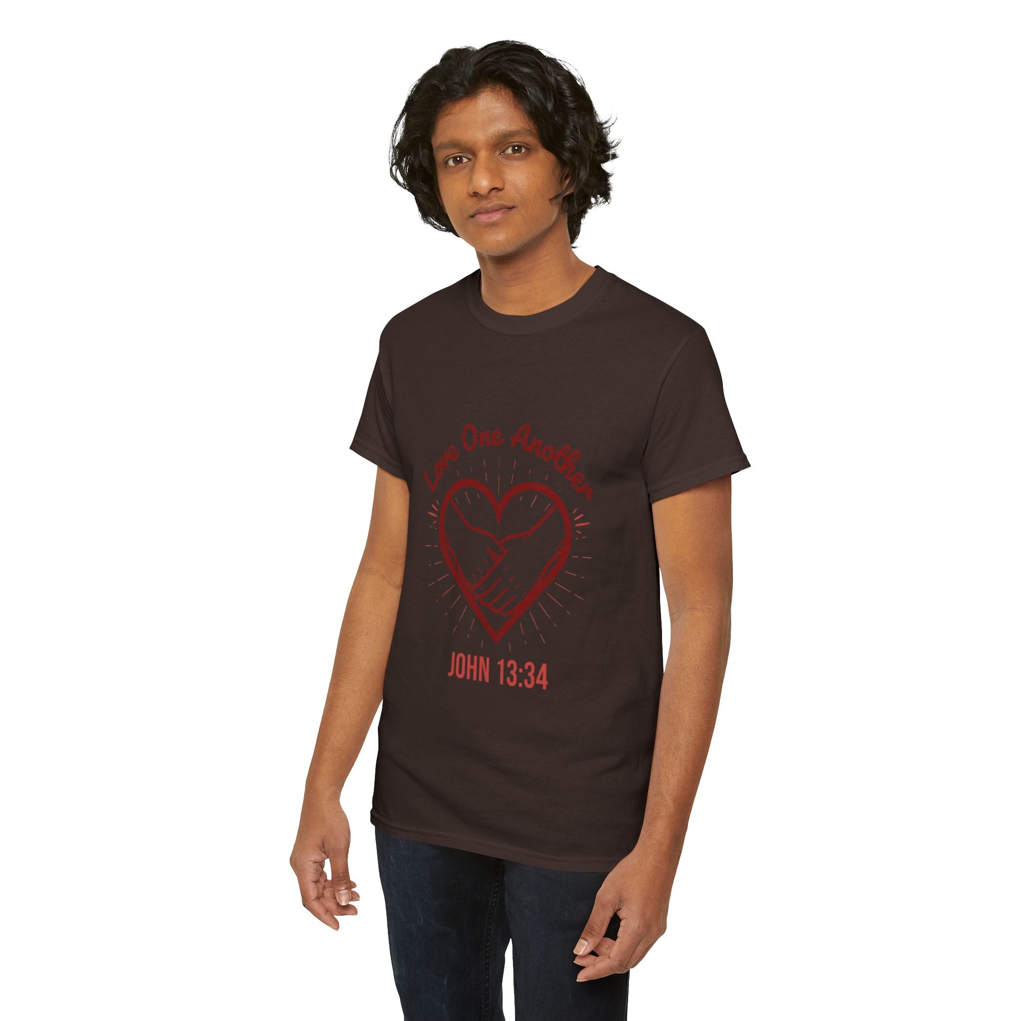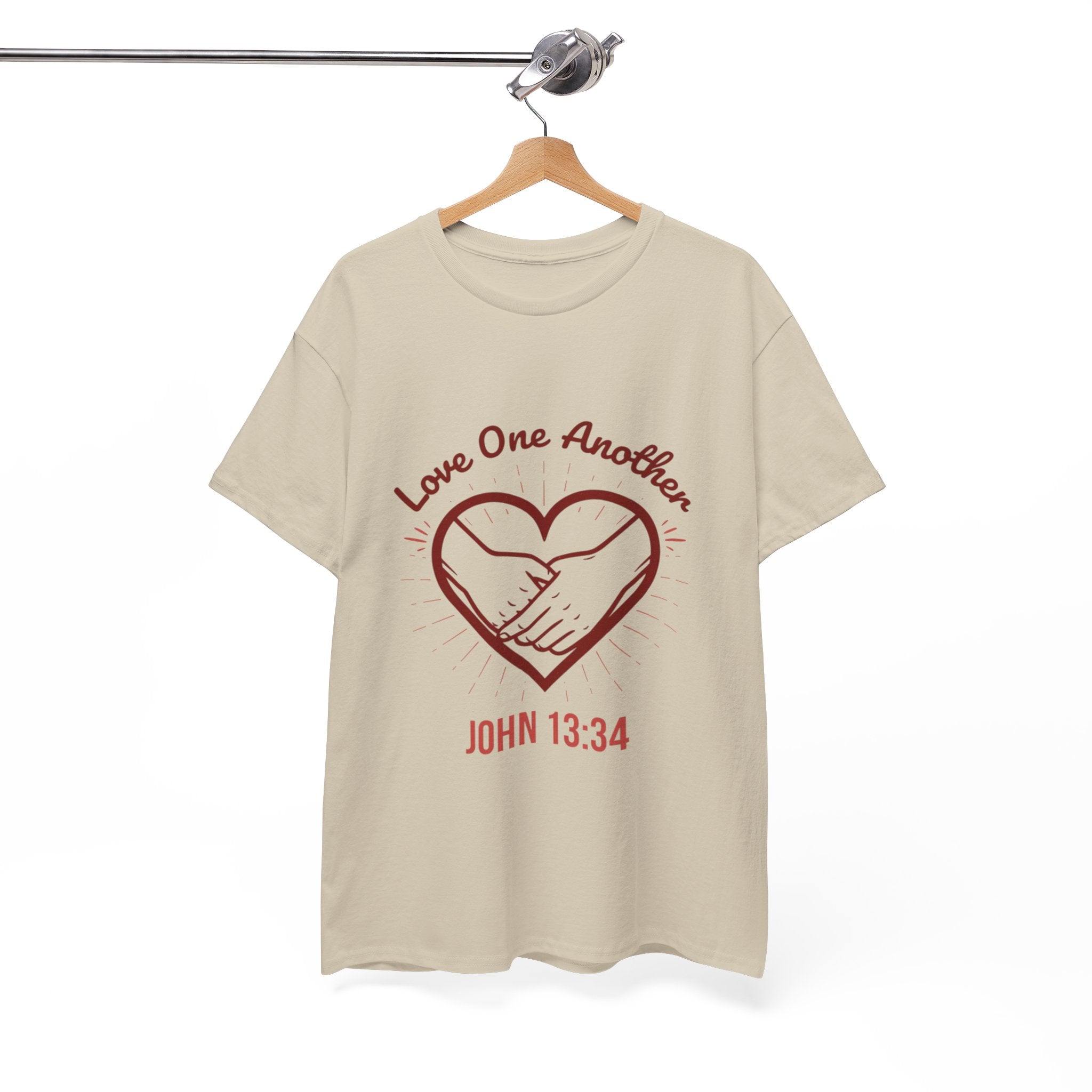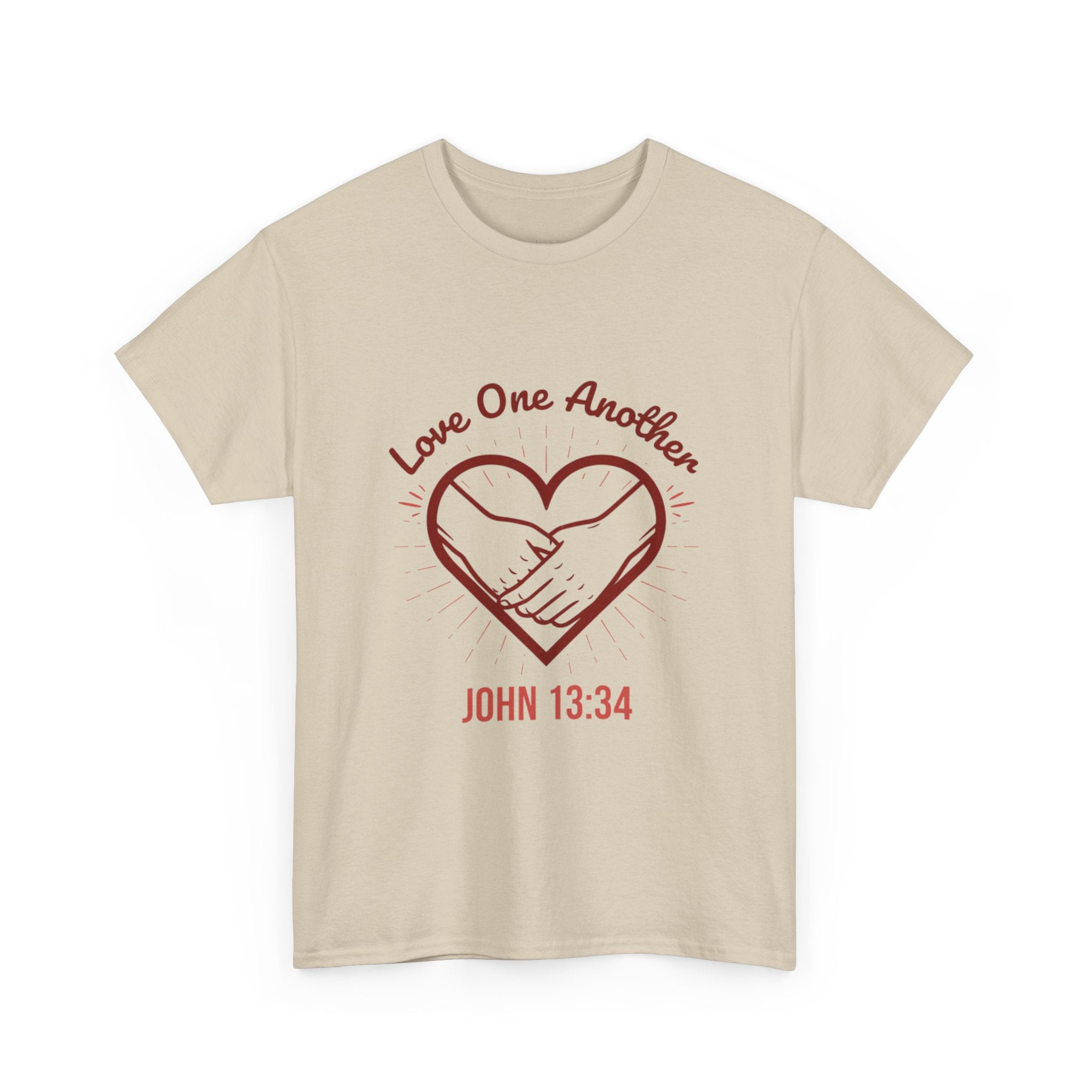 Soft, simple, and quietly bold, this tee carries a gentle message: Love One Another (John 13:34). The hand-drawn heart and joined hands sit close to the chest, a subtle reminder of faith in action. The relaxed crew fit and smooth, medium-weight cotton make it easy to wear during community gatherings, church events, or slow Sunday mornings. It layers under jackets or stands on its own, letting the message feel personal rather than loud. For someone who lives their faith through small acts, this shirt becomes a comfortable way to speak compassion without saying a word.