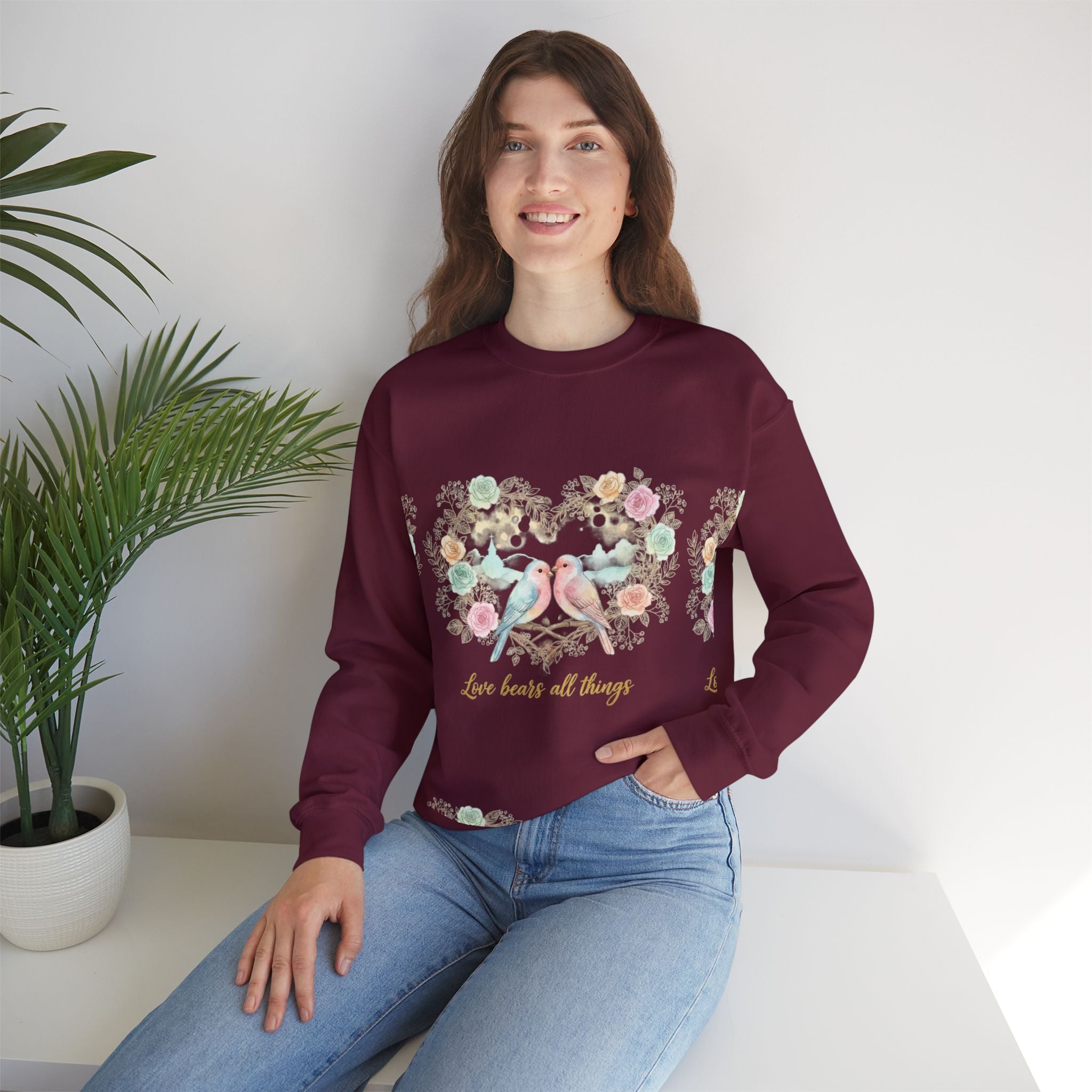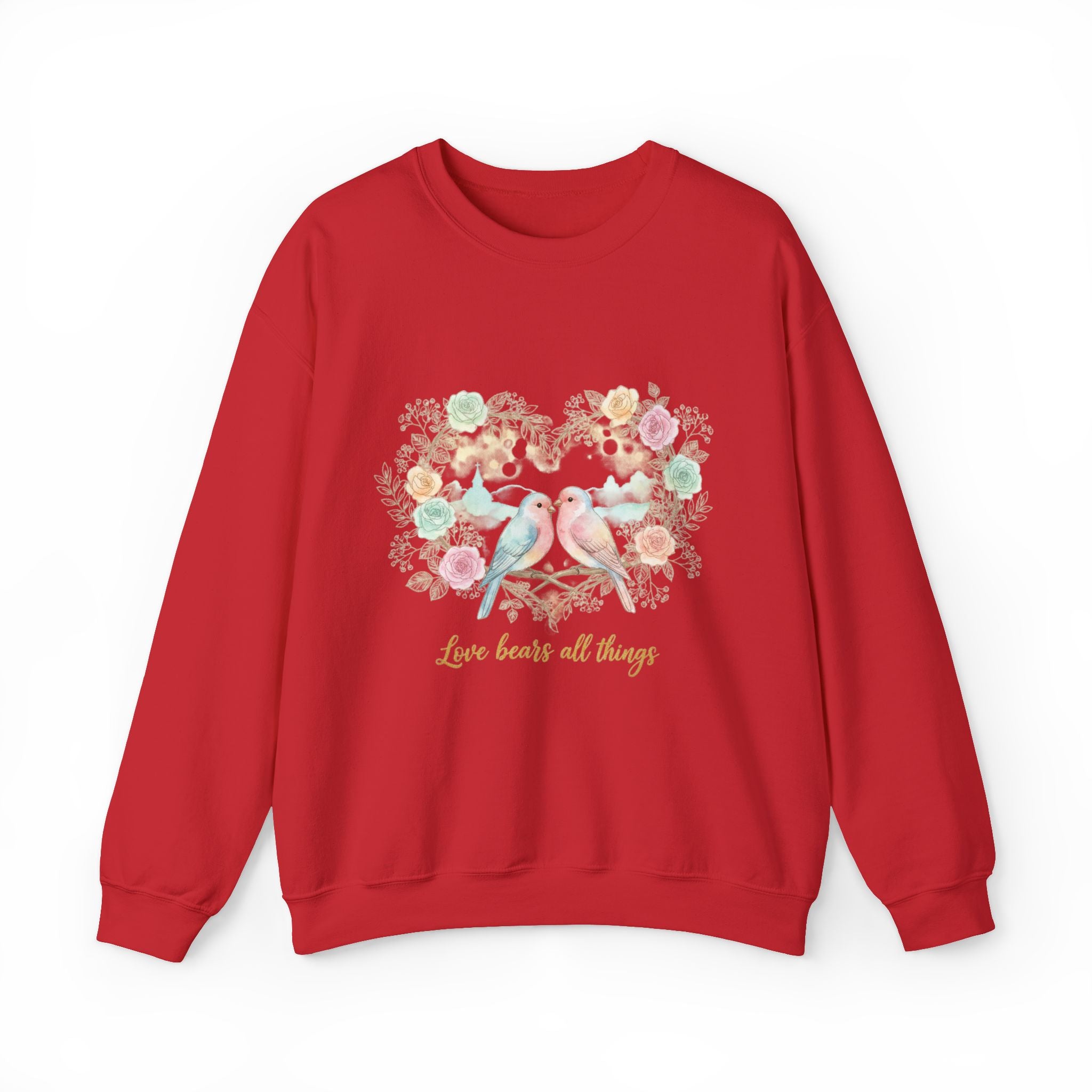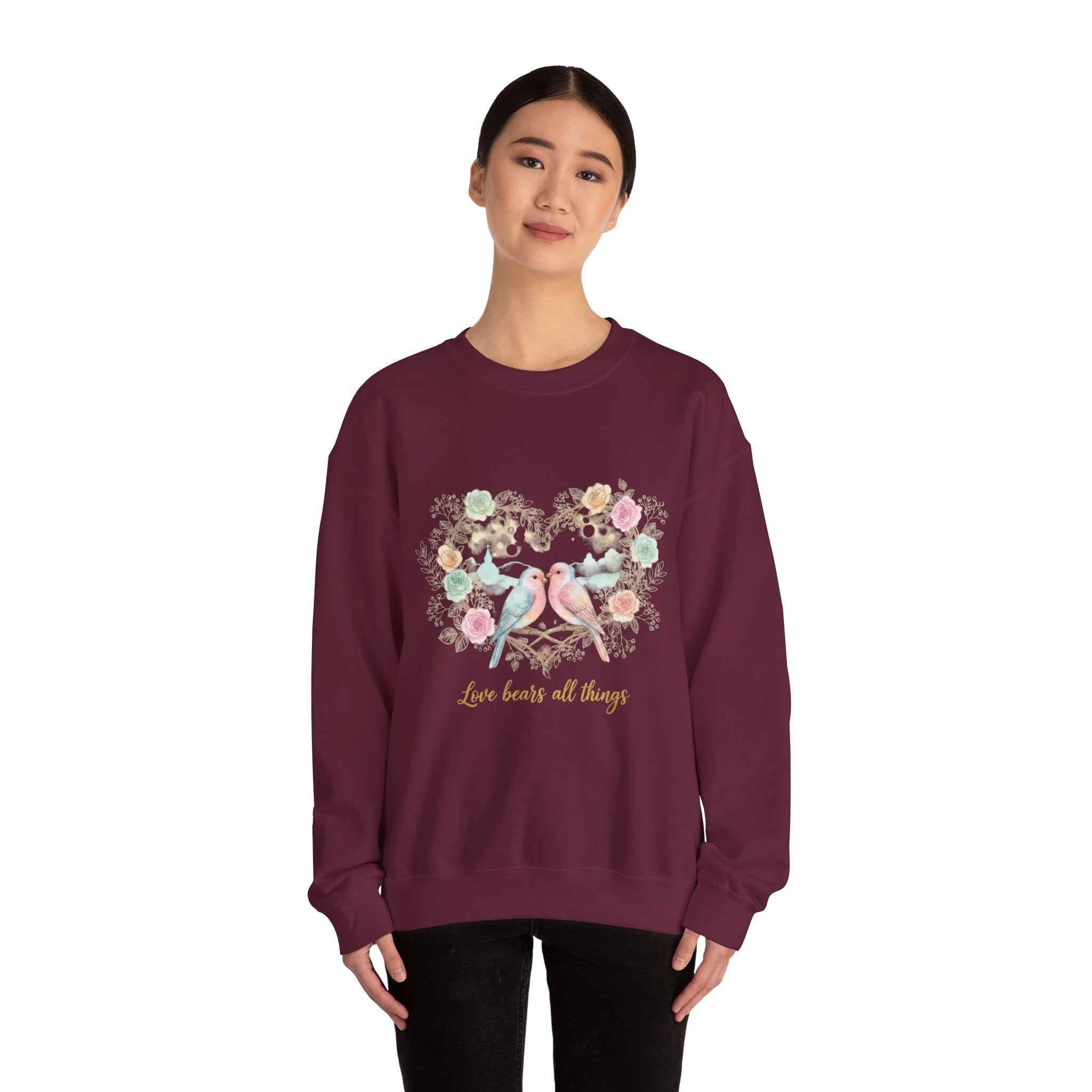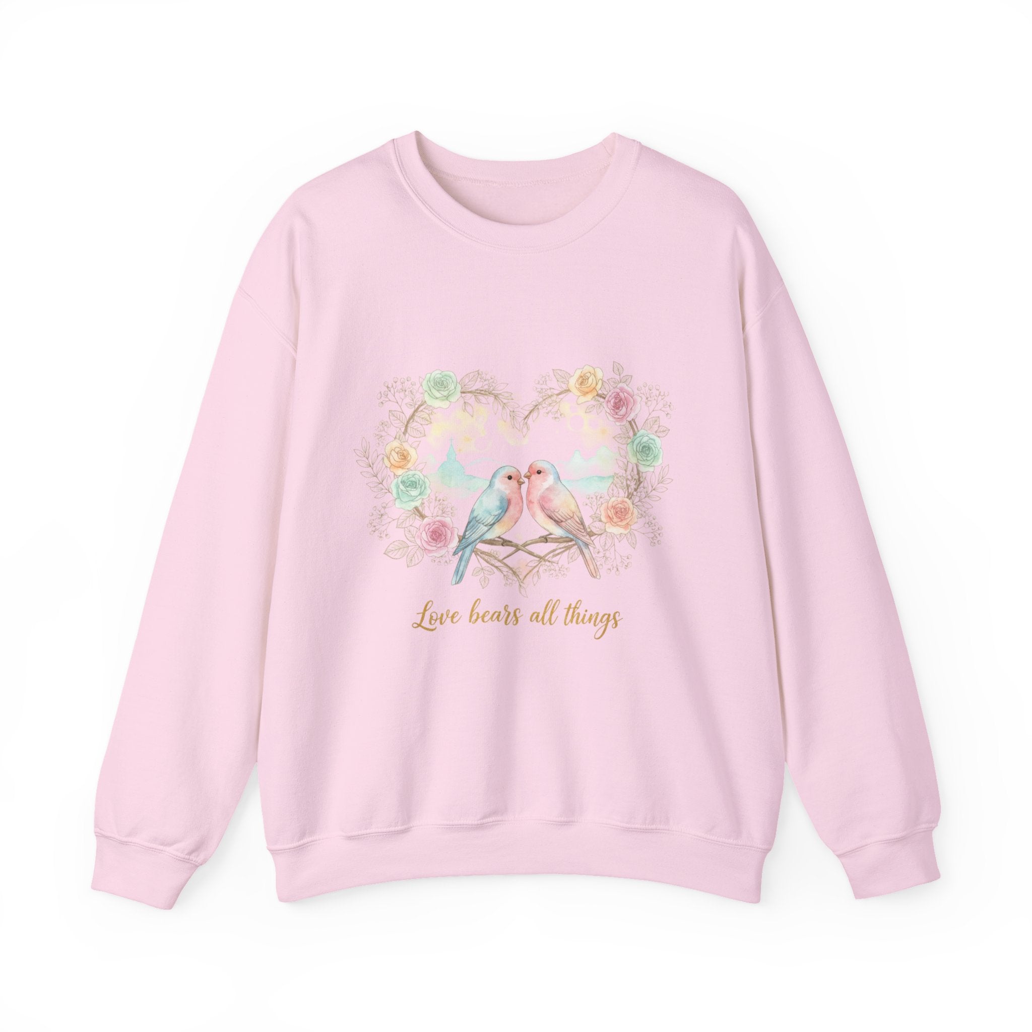 Crewneck Sweatshirt, Pastel Love Birds Floral Heart “Love bears all things”