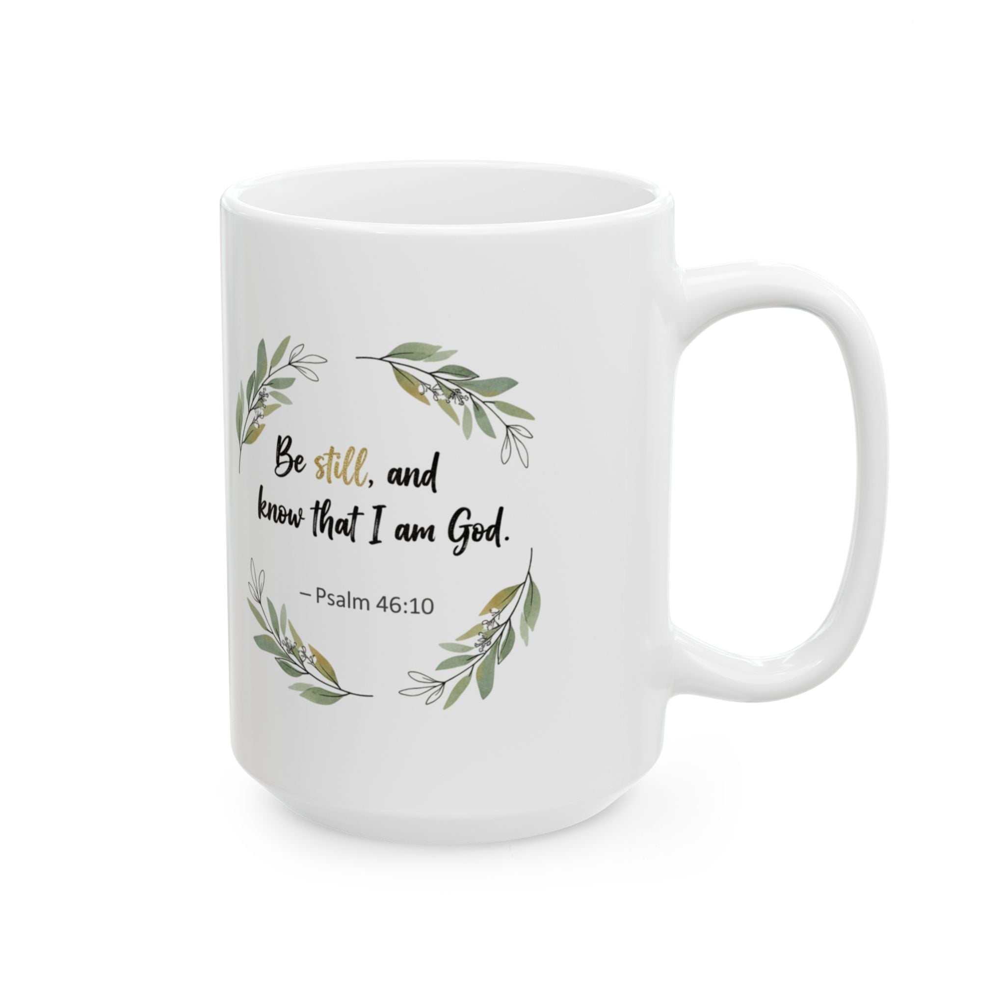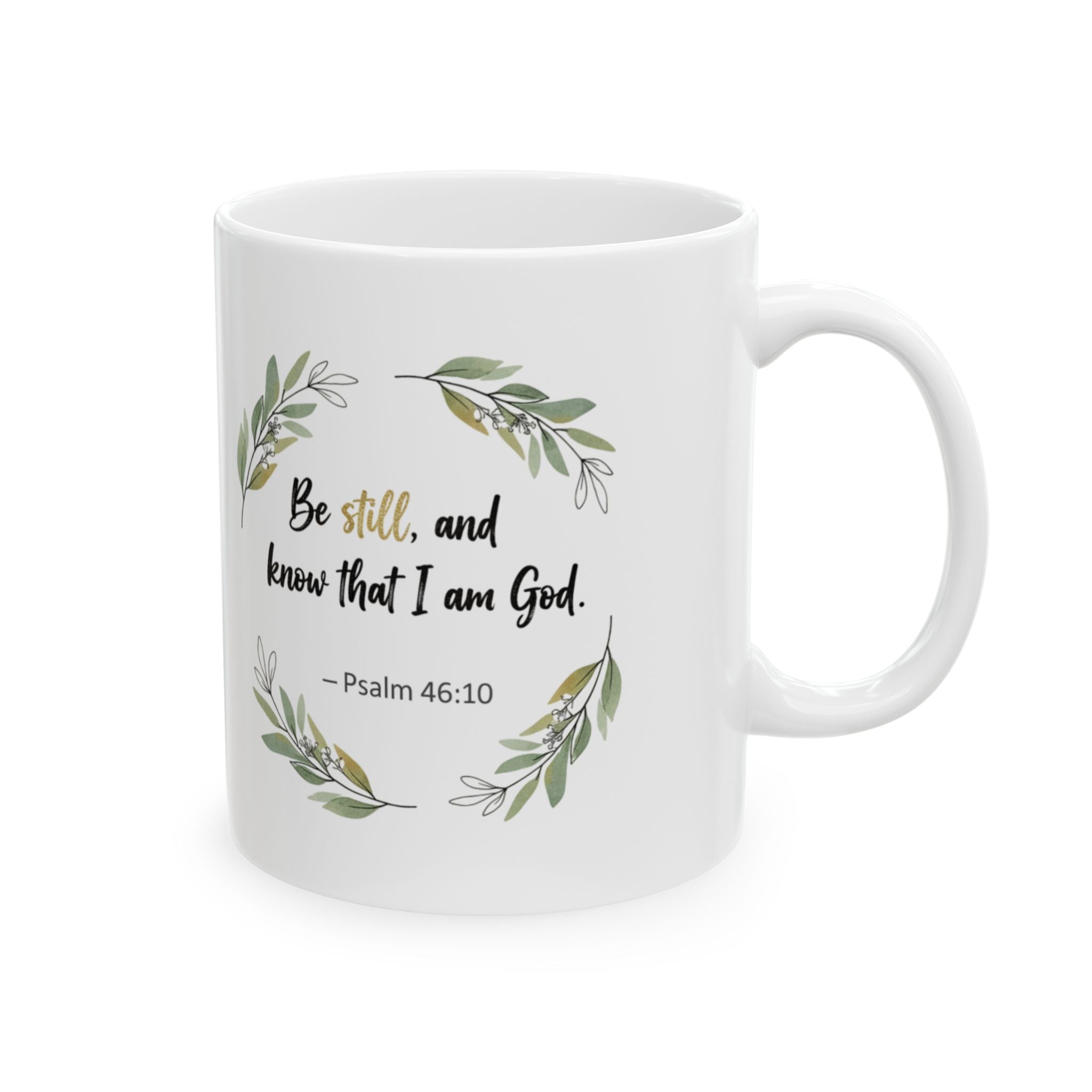 A simple, soothing ceramic mug that brings quiet encouragement to everyday coffee and tea moments. Soft watercolor sprigs wrap the white gloss surface, framing a small, faith-forward phrase in gentle script “Be still and know that I am God”. It warms hands and spirits alike: morning prayers, mid-afternoon breathers, and slow evenings feel calmer when held. Lightweight but sturdy, it slips into daily routines: the kitchen counter, the office desk, or a nightstand for late-night sips. The subtle botanical art and muted palette suit peaceful homes and thoughtful routines without shouting for attention.